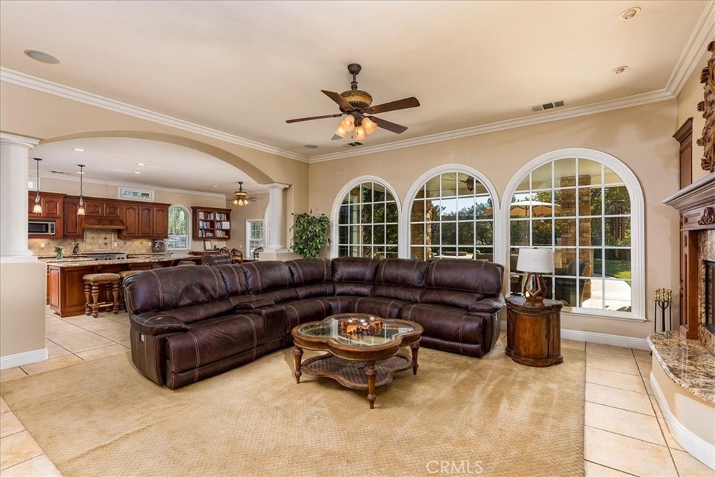 Welcome to this Beautiful Single story custom pool home in the prestigious gated community of Meadow Oaks,this home features 3,394 sq. ft. of gorgeous open living space, situated on 4.6 acres of natural boulders and ancient oaks. Entertain family and friends in the resort like back-yard featuring a gorgeous pool spa , fire pit and a new Aluma-Wood covered patio with ceiling fans lighting and BBQ island. The Large open floor plan features a great room with wood burning fireplace a raised granite hearth and built in entertainment center. A Flex Room adjacent to entry can be used as formal living room, den, office, or music room. The huge gourmet kitchen includes built-in Kitchen Aide appliances . Wood paneled Built In side by side refrigerator, double oven, microwave oven, six burner professional cook top, dishwasher, and trash compactor. The kitchen has a smaller prep island an enormous three-sided island and spacious eating area. A Built in bar with glass door cabinets, wine storage , and built in wine/beverage cooler is perfect for entertaining. The large Formal dining room seats 8, with room for your buffet or large china cabinet. The master suite boast a sitting room with gas fireplace and built-in bookcases, a luxurious bath with double sinks, large soaking tub, walk-in shower and large walk-in closet with built in drawers and shelving units.Two additional large bedrooms each have their own private bath, walk-in closet, and room for a sitting area. The Laundry room has utility sink plus plenty of counter space and cabinets. Upper cabinets are extra deep to accommodate craft boxes and supplies All rooms have ceiling fans, 5 1/2" designer base boards, crown molding, custom shutters. The Oversized three car garage has one extra deep bay (almost tandem sized) for all your extra toys and tools plus a huge workshop with built in work bench and cabinets as well as a utility sink In addition to the regular pool heating unit there is a rack of solar panels to help in heating the pool.