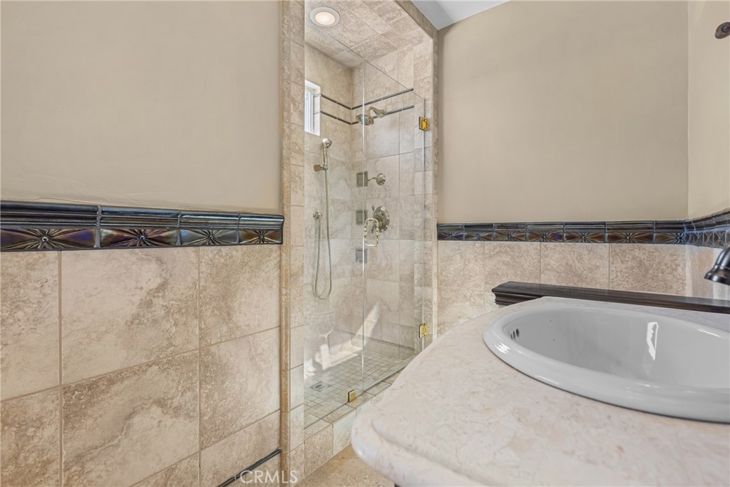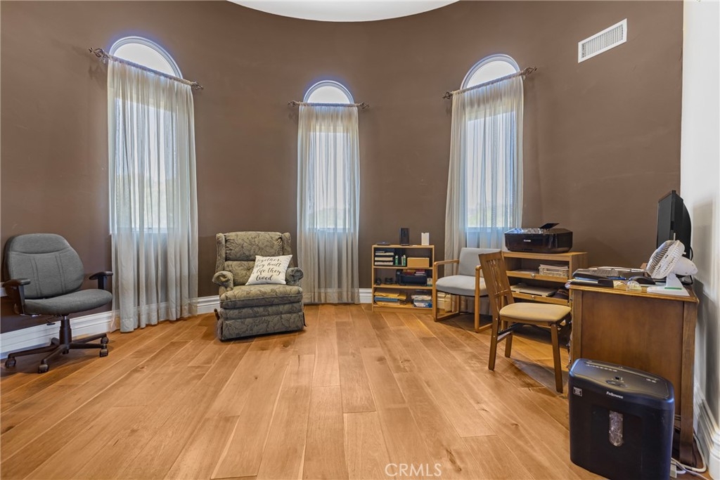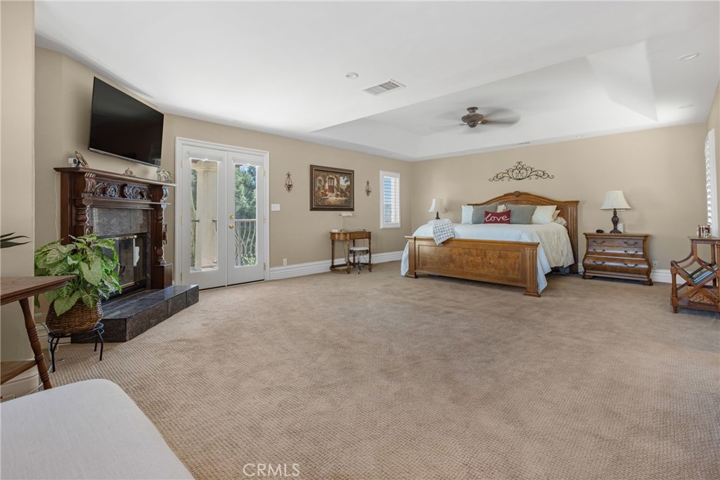 Upstairs, two spacious bedrooms share a stylish bath, while the library office in the tower room offers inspiring views. The primary suite is a true retreat, with French door access to an outdoor sitting area and a spa-like bathroom featuring a spa tub, walk-in shower, and separate his-and-hers closets.