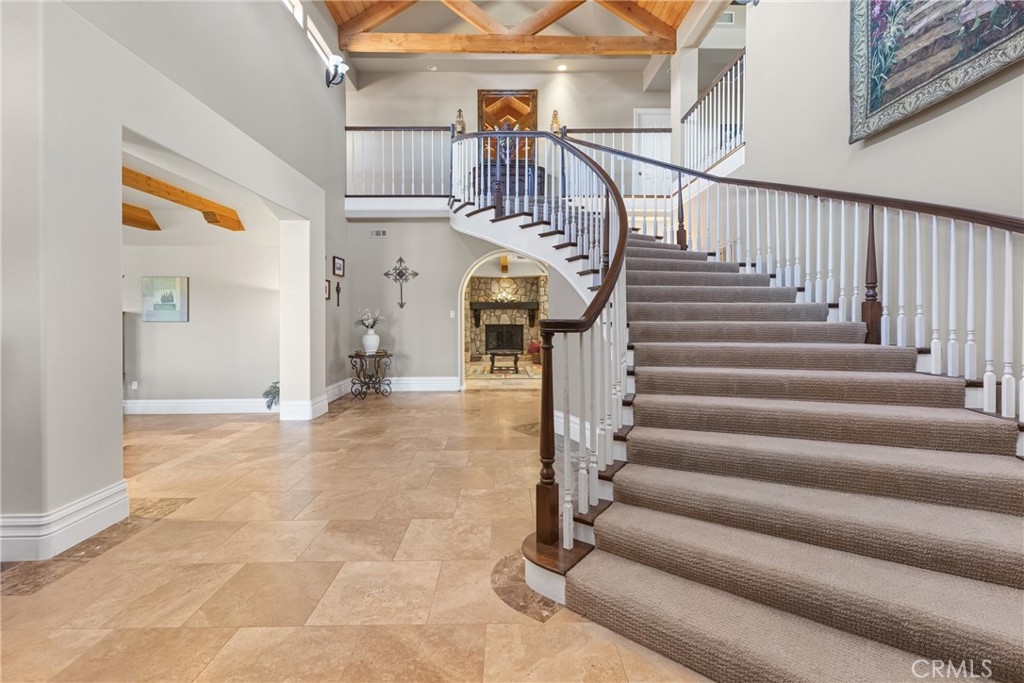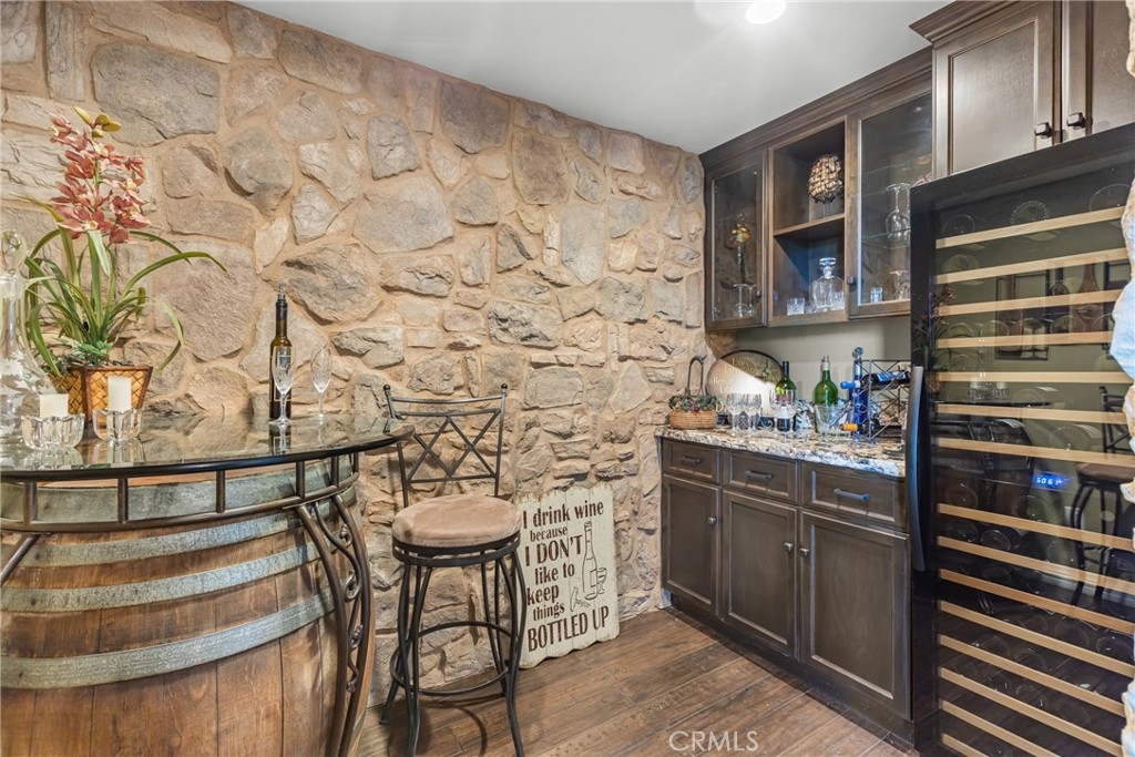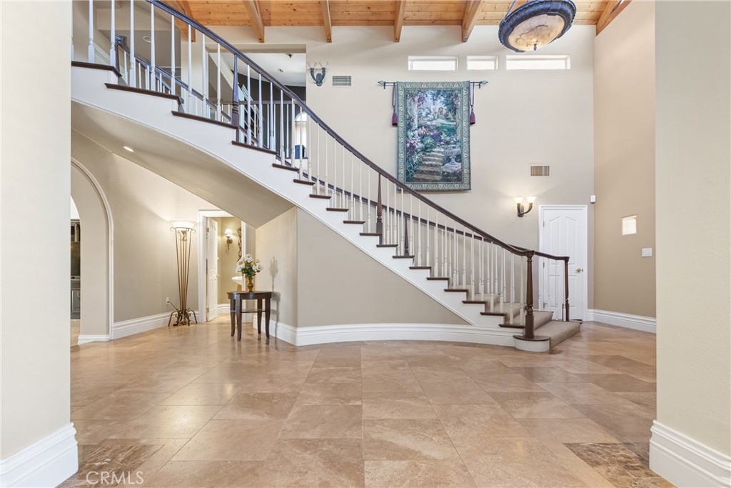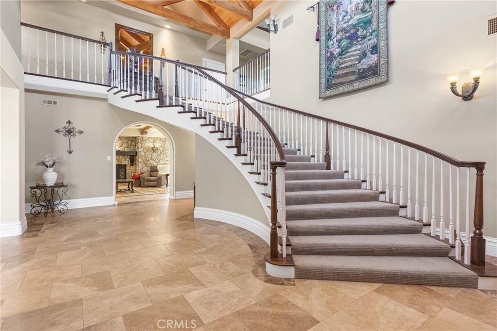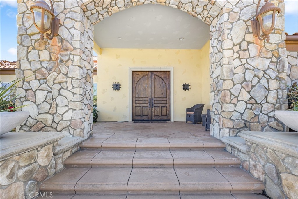 Enter through a stately gated entrance and follow the tree-lined drive to the circular motor court. The stunning stone façade and grand entrance set the tone for what lies within. A sweeping staircase greets you, and an adjacent elegant living room leads to a formal dining room with French doors opening to a charming front patio with serene views. Beyond the dining room, a wine room boasts a 100+ bottle refrigerator and dry bar.