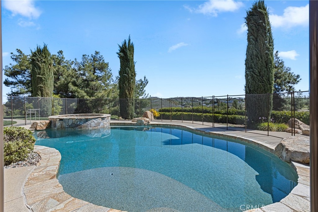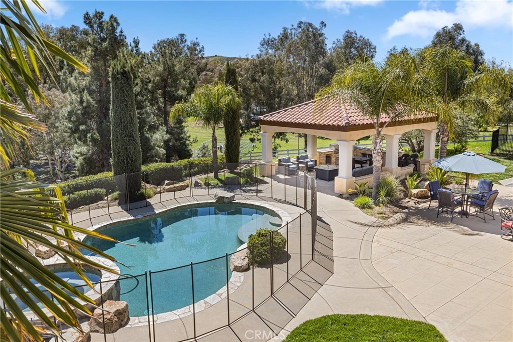Step outside to your private resort! A sparkling pool and spa accompany the outdoor kitchen cabana, ideal for outdoor dining and entertaining. Beyond the pool, lush grounds lead to a gently sloping pasture and round pen - perfect for equestrians - with space to add a guest home and barn.