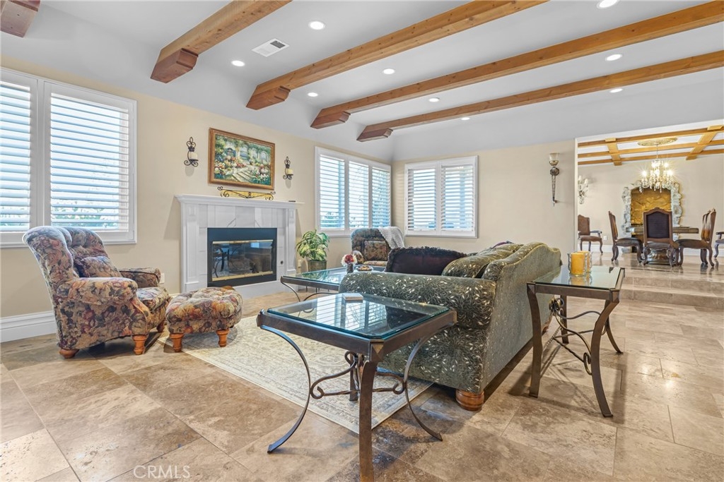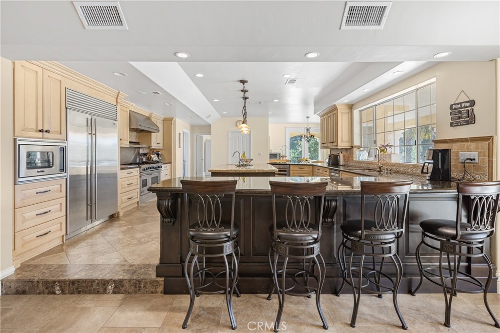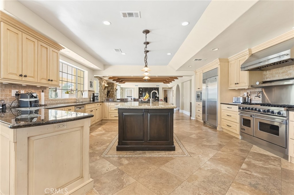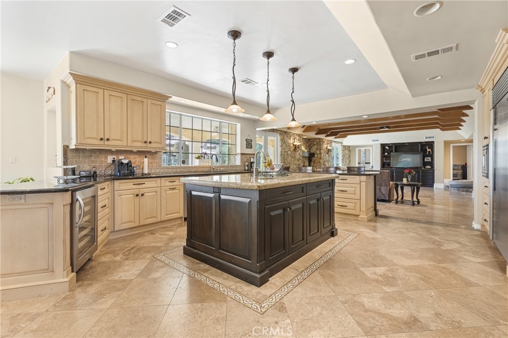 The heart of the home is the chef’s kitchen, featuring premium appliances, custom cabinetry, and an expansive island. The open family room boasts beamed ceilings and an impressive fireplace, creating a warm, inviting atmosphere. Also downstairs is an en-suite bedroom and bath with its own entrance, and a large laundry room with deep sink and ample cabinetry.