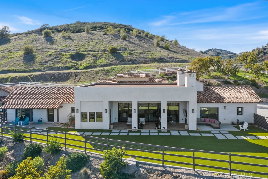 Gorgeous custom single story executive home on 5 acres, with gated circular driveway, beautiful landscaping, hardscape and fenced yard with artificial turf, infinity pool and spa with integrated custom daybed, Trex deck, covered Barbecue Bar, separate Casita with Bathroom and closet, and endless panoramic views as you peer over your 200+ avocado trees below. Unparalleled beauty and function abounds in this home, custom designed by d’Arcy & Associates Architecture, Irvine. The solid wood arched entry door, double 2x6 framed walls, tile plank flooring throughout, 16’ ceilings in main living area, Haiku ceiling fans and designer light fixtures throughout, Anderson casement dual-paned windows and sliders, recessed lighting with Lutron dimmers throughout, and custom cabinetry throughout, set the stage for the open floor plan complemented with 30’ La Cantina invisible pocket door off the Great Room, creating the relaxing indoor/outdoor space of the ‘California’ Room with double sided fireplace, recessed lighting and ceiling fans. The Kitchen has stainless steel KitchenAid appliances, the oversized island with bar seating, farmhouse sink and waterfall quartzite counters, and separate Breakfast Nook, and a separate Butler’s Pantry with additional sink, storage and open counter space. Each Bedroom has it’s own individual Bath. The Office also has it’s own Bath, plus a custom built-in desk with bookshelves. Vaulted Ceiling in the Master bedroom gives a very spacious feel; Master Bath has quartzite counters and limestone flooring and shower, and walk-in closet with custom shelving. The Entry Hall from the Garage has more unique storage spaces, separate Laundry Room with sink, and a Guest Bath. There are far too many more details to list, but the ‘must mentions’ are the 4 car tandem Garage with 10’ doors on each end with finished drywall and recessed lighting; home exterior is finished in Smooth stucco; Spanish Tile Roof; and El dorado stone; the property is fully sprinklered, has 60 GPM Well with 5HP pump, is pumped at 4 locations for fire hose hook up, has 500 gallon propane tank, and the entire property has vinyl fencing. Located in the ranch community of La Cresta of 5 acre minimum properties, just minutes from the conveniences of town, schools, shopping and freeways, and surrounded by rolling hills, horse ranches, and vineyard here in the Santa Rosa Plateau, This Home will not disappoint!