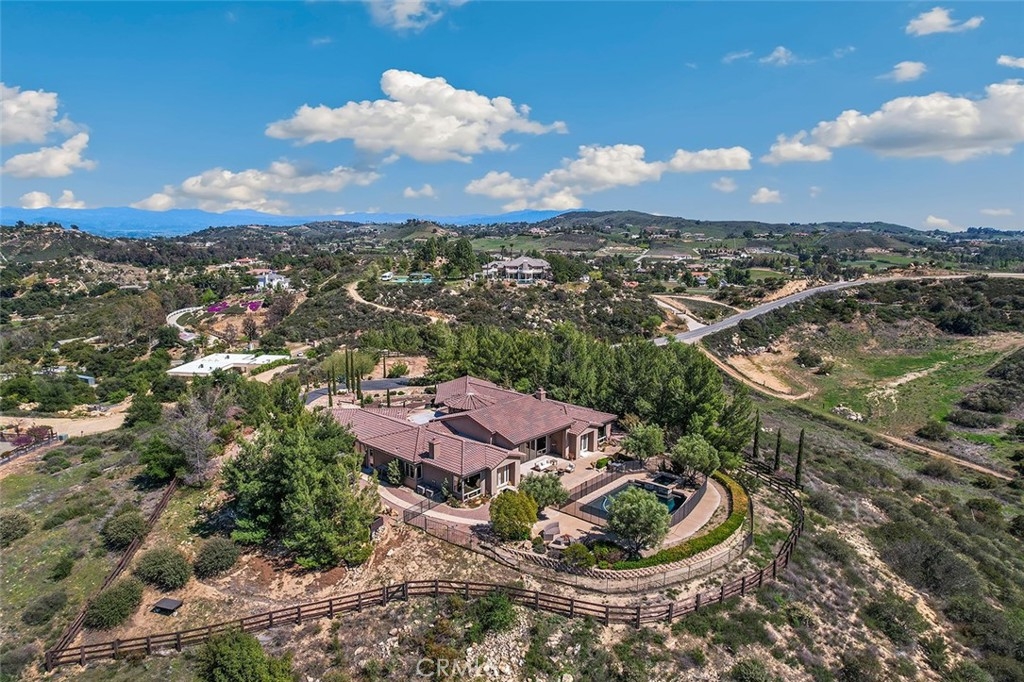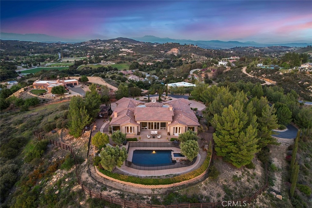 UTMOST PRIVACY & STUNNING VIEWS FROM THIS 10-ACRE SINGLE-STORY ESTATE IN LA CRESTA! Even has room for horses with submitted barn & arena plans! This single-story Showstopper is a “WOW” from the jump! From one of the best streets in La Cresta (Vista del Bosque means “View of the Forest”), the long private tree-lined driveway leads you to an automatic entry gate, accessing this magical estate. Notice the abundant use of natural stone (quarried from the property), as you head toward the custom iron front door and into the vaulted entry, where you will immediately be greeted, through a wall of glass, by the inviting resort-style pool and unobstructed panoramic mountain views. At dusk, as the sun sets over the Cleveland National Forest, the color palette goes from daylight to every imaginable shade of lavender. With views from every room in the house, the inside of this Italian-inspired home will not disappoint. Find 10–22-foot ceilings, all ensuite bedrooms, 8-ft solid doors, spacious great room, separate media room, wet bar, and a chef’s kitchen with 4 dishwasher drawers, & massive eat-around island. One of the two garages has been tastefully converted to a spacious bonus room, to be used how you like (currently is a game room). The grounds are very interesting with varying elevations, walk paths, gardening pavilion, RV parking pad and wood fencing. The pad adjacent the house is plenty large enough for an ADU or workshop, and the bottom 4 acres, already stubbed for power, has views of the forest and abundant flat land to create a dream horse or farm area. Views like this are one in a million. Add the immaculate, high-quality, dramatic, private estate, and you have a formula for a STUNNING FOREVER HOME! *****SANTA ROSA PLATEAU: 5-acre minimum parcels (10-acre minimum. in SR West), just minutes to schools, restaurants, hospitals, grocery stores, 15 Fwy & Temecula Wine Country. Enjoy this peaceful ranch community w/no commercial businesses, robust social activities, miles of private community trails & 1000s of acres of Ecological Reserve…All less than 1.5 hours from LA, SD, OC, Palm Springs & Big Bear. Discover the country, yet convenient, lifestyle of La Cresta, Tenaja & the Communities of the Santa Rosa Plateau!