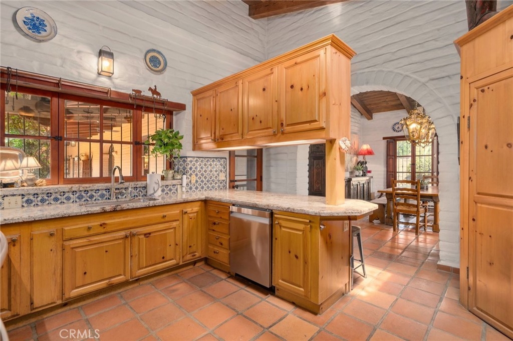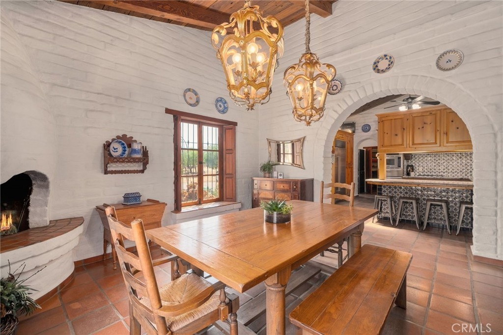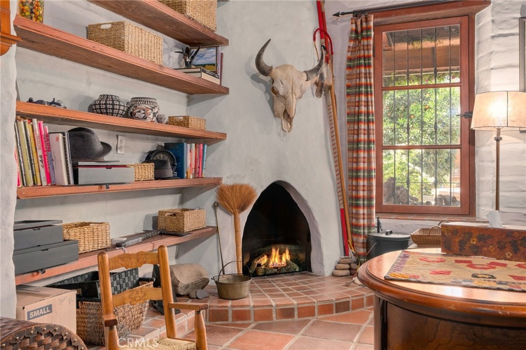 Inside, the hacienda reveals its character. The formal living room is anchored by a grand fireplace, its wood mantle reclaimed from an 18th-century Kentucky estate. Imported details—wrought iron window grilles, cantera stone columns, and handcrafted pavers—bring the spirit of Mexico into every corner. The kitchen is warm and inviting, with pine cabinetry, a blue tile backsplash, granite counters, and Sub-Zero refrigerator. Off one side, the family room beckons with a wall of bookshelves and a Hacienda-style floor-level fireplace, perfect for quiet evenings. On the opposite side, the dining room glows with the charm of a beehive fireplace, making every meal feel like a gathering.