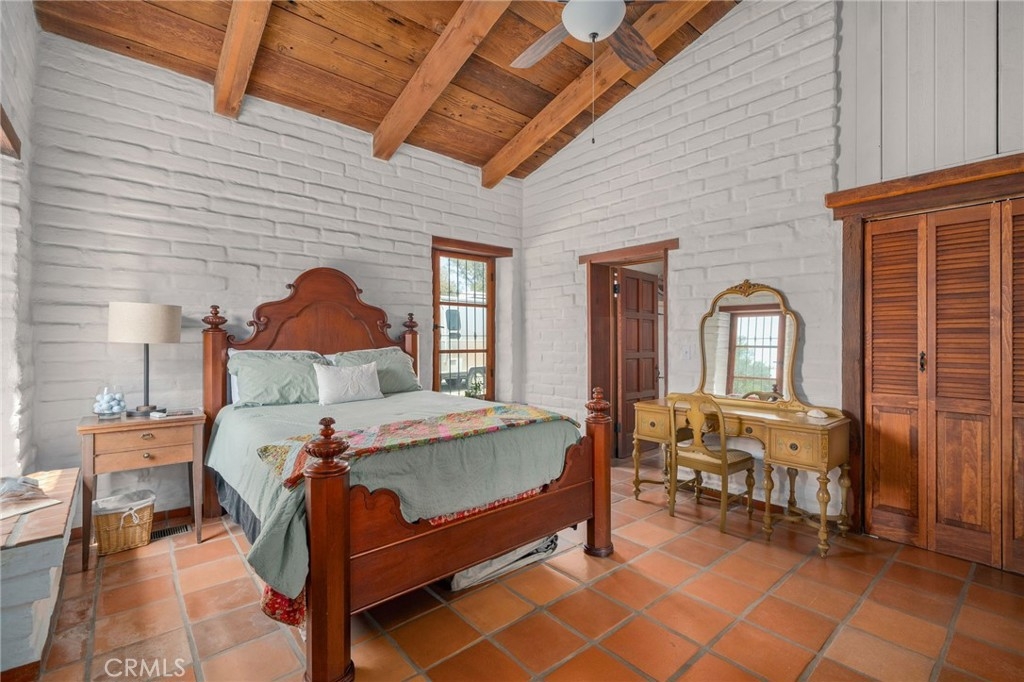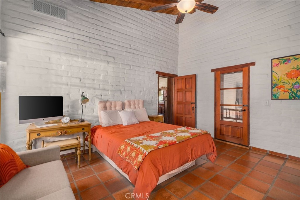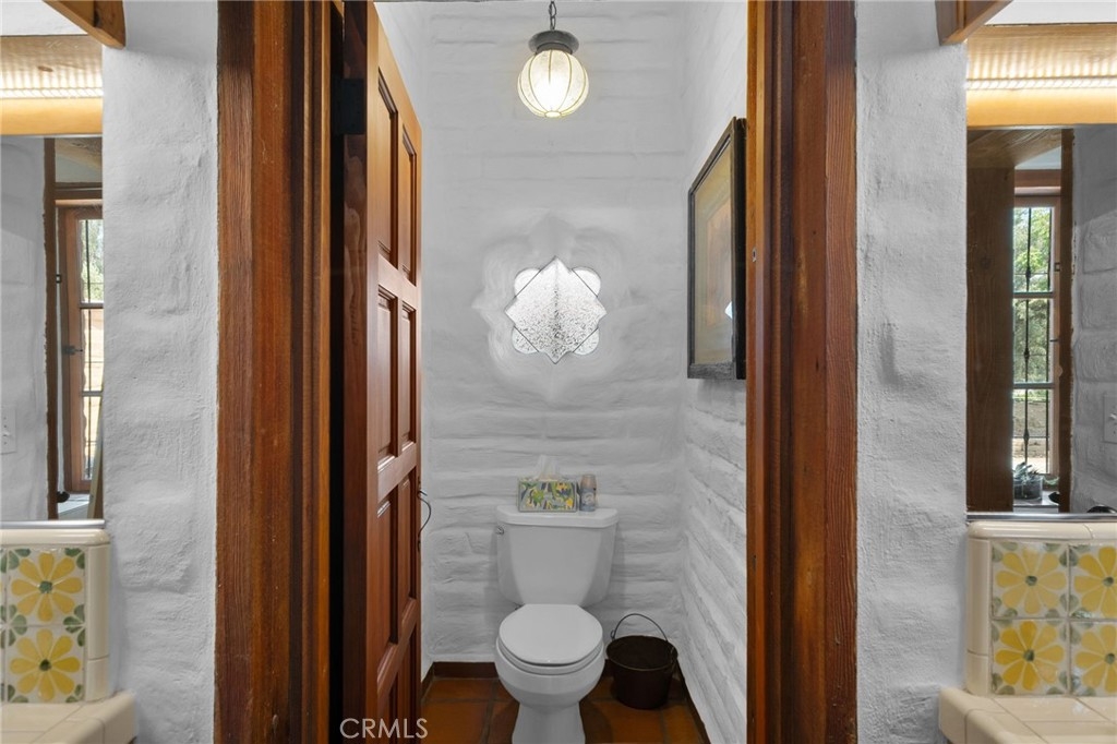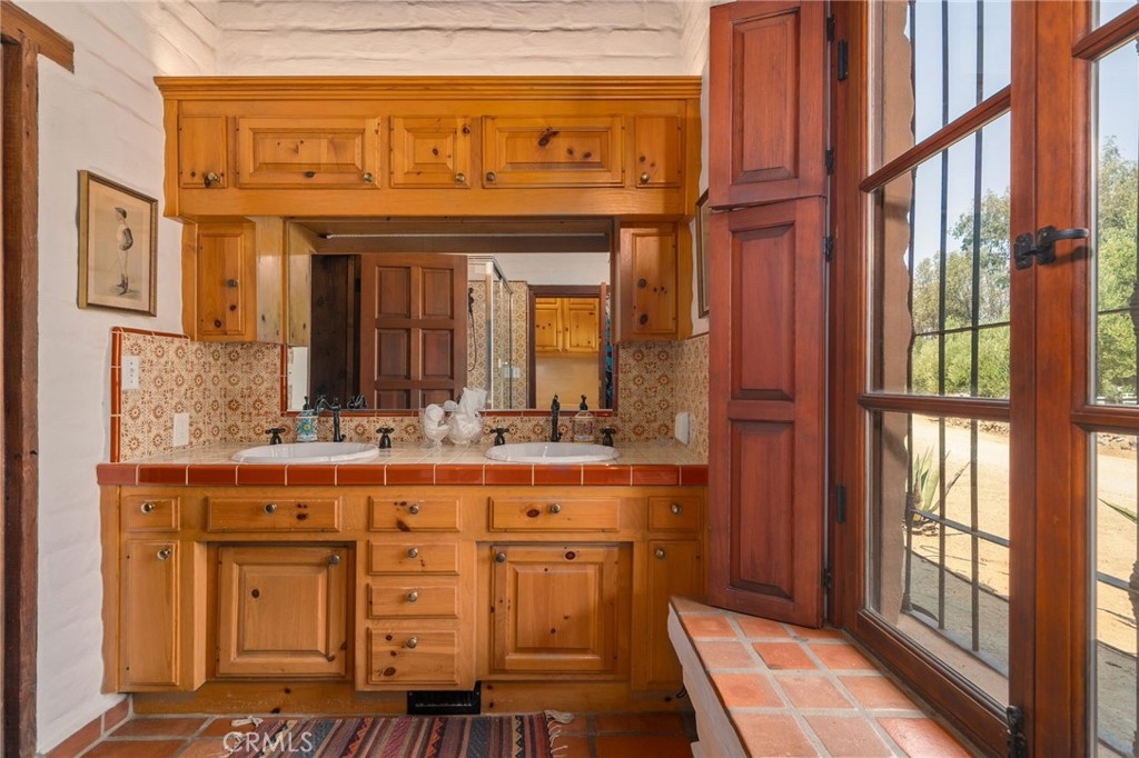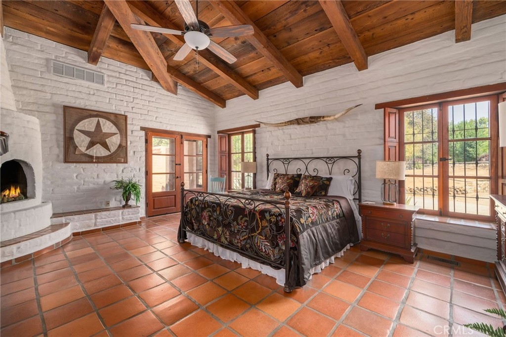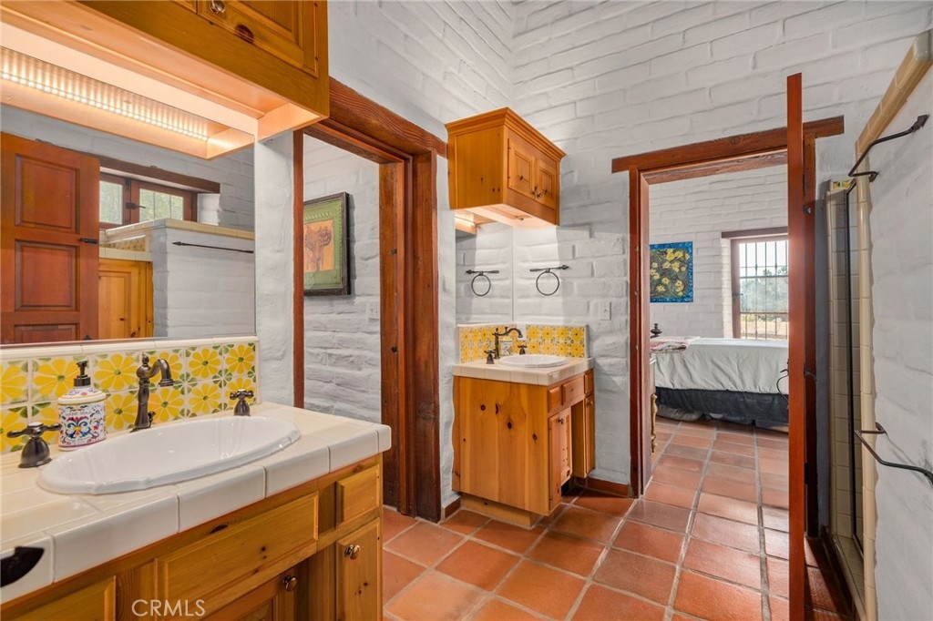 The primary suite opens to its own private patio and features a cozy sitting area with a New Mexico–style corner fireplace, complete with a raised hearth and rustic mantle. Its adjoining bath, with hand-tiled counters and shower, enhances the hacienda character. Two additional spacious bedrooms share a colorful bath finished in cheerful yellow and green Mexican tiles. Each room, true to hacienda tradition, opens directly to the courtyard, ensuring the garden and views are always close at hand.