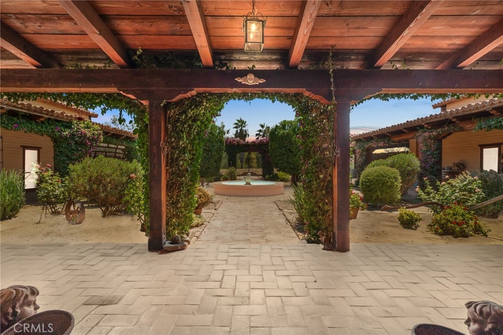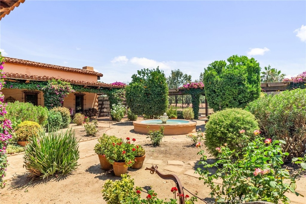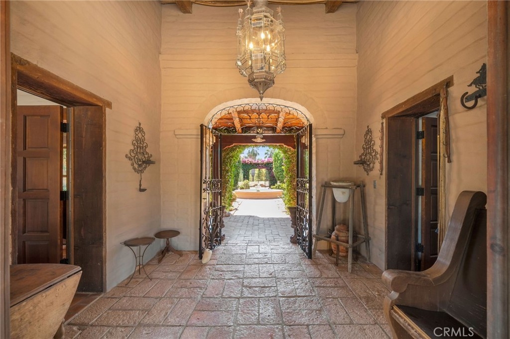 Arriving at the gates, you step through a portón—designed after the San Gabriel Mission—into a shaded vestibule, where the first view through the “Chancel Gate” is not of walls, but of open air: the courtyard and covered patio at the heart of the home. Fruit trees and flowers frame the fountain, their fragrance drifting through the breezeways that connect every room.