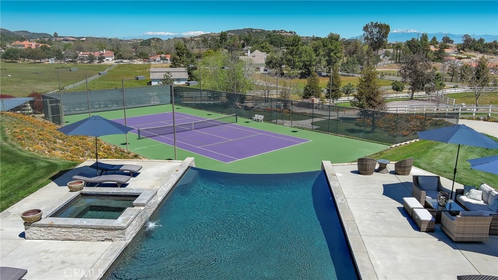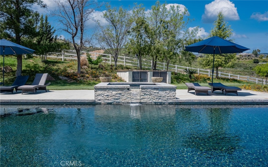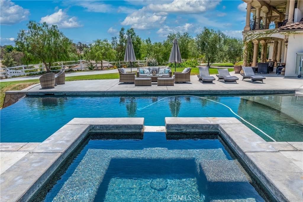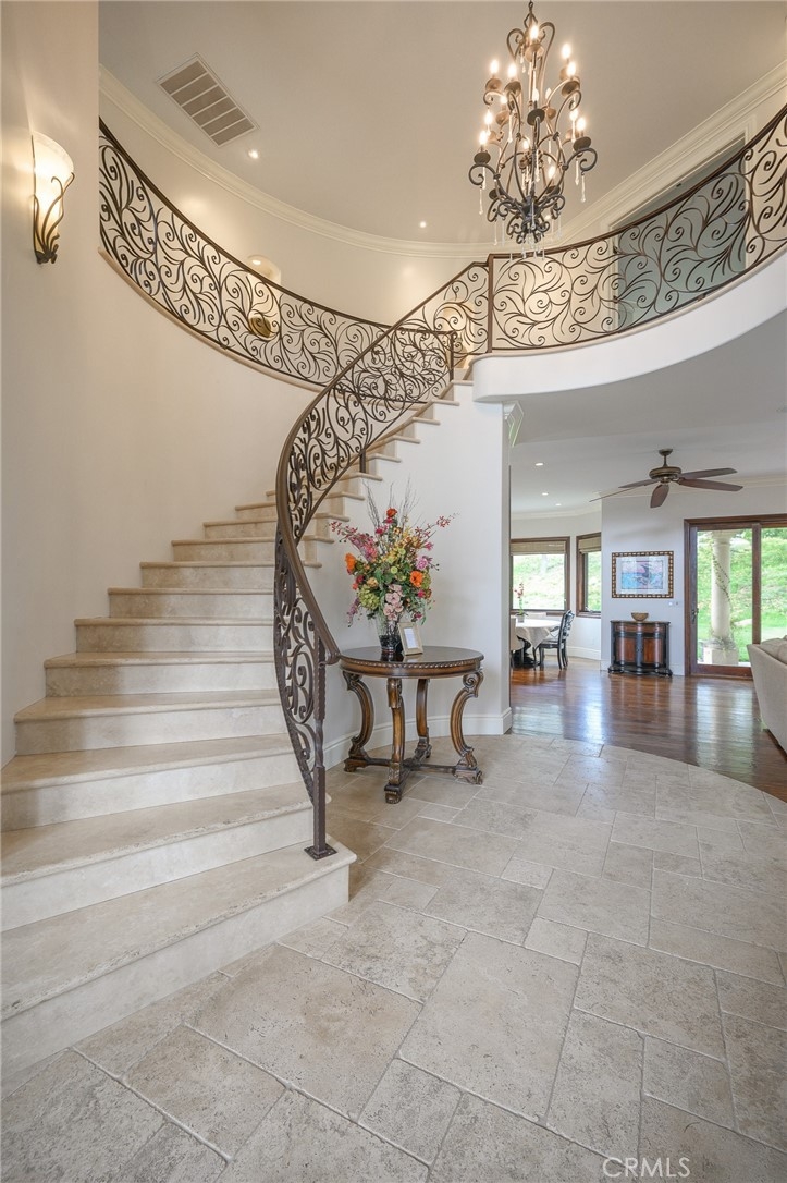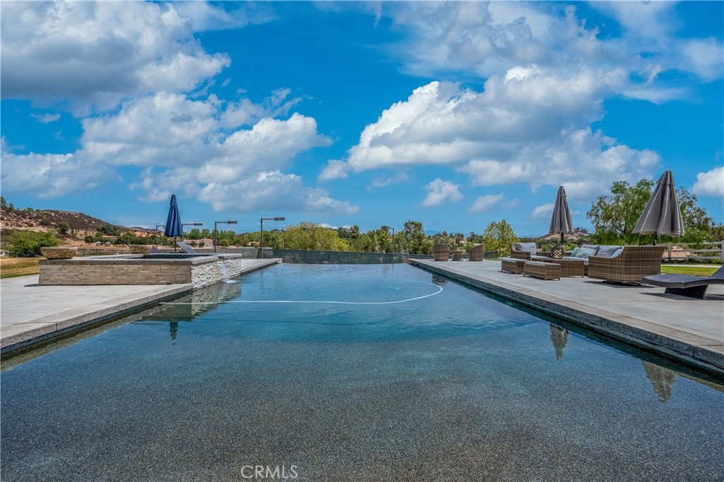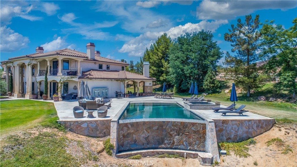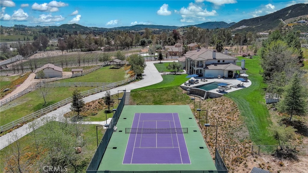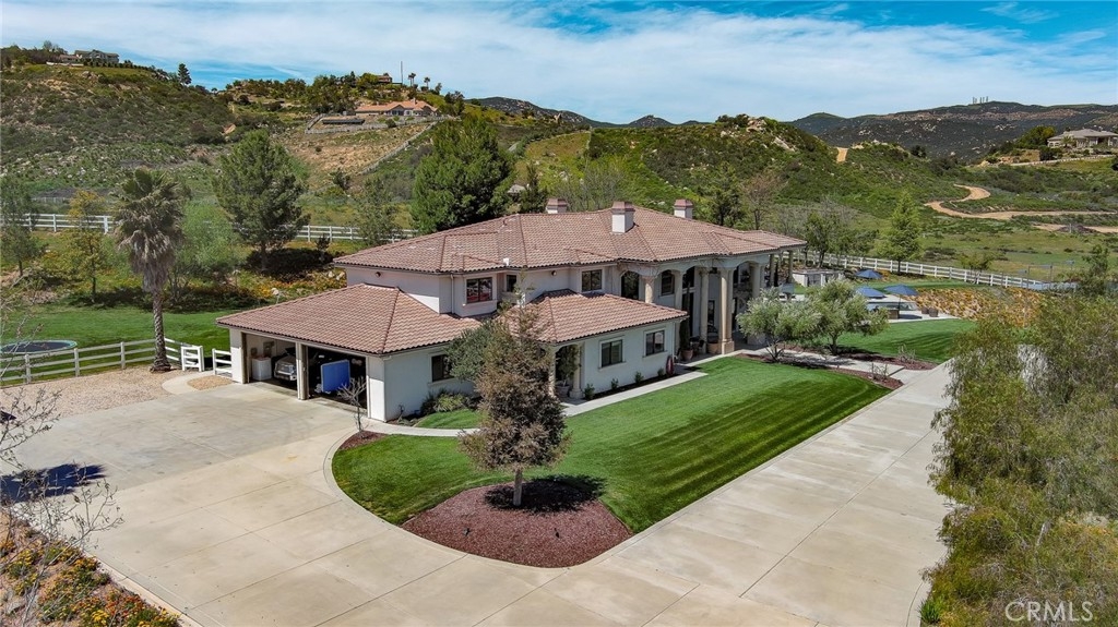 Live in the Luxury of a Stunning La Cresta Estate, sprawling 6,079 SF (+/-). This Custom Home sits on a Hillside w/ 5+ acres and a Resort Style Infinity Edge Pool, Spa, Lighted Pickle Ball/Tennis Court, and Horse Facilities. The Home Features 6 Bedrooms & 8 Bathrooms (including Casita w/ Kitchenette and Private Entrance), Formal Entry w/ Custom Tall Front Doors, Luxurious Dining & Living Rooms w/ Vaulted Ceilings and Dual Sided Fireplace and a Butler’s Pantry. Entertainer's Dream Kitchen w/ 2 Elongated Granite Serving Islands, 2 Dishwashers, Viking Refrigerator/Freezer & Large Walk-in Pantry. The Kitchen is Adjacent to the Great Room and Custom Bar (w/ Wine Refrigerator) and Custom Stone Fireplace. The Home also Features a 9 Seat Theater Room w/ 110" HD Screen & Surround Sound System. Spacious Office w/ Custom Cabinetry. Formal Spiral Stone Staircase w/ Chandelier leads you to the Upstairs Master Suite w/ Retreat and Fireplace. Luxury Master Bath w/ Dual Vanity Sinks, Spa & Shower, and Large Walk-in Closet. Adjacent to the Master Bedrooms is a Fitness Room w/ a Balcony and Majestic Views. Two Laundry Rooms on each Level. Expansive 8 Car Garage plus Parking Area for RV and Trailers. Beautifully Manicured Grounds. Horse Facilities w/ a 4 Stall Barn & Large Riding Arena & Paddocks. Energy efficient Home w/ Solar (60 Panels Paid Off), Back-up Power System, and Well Water for Lush Lawns and Foliage All Year Round.