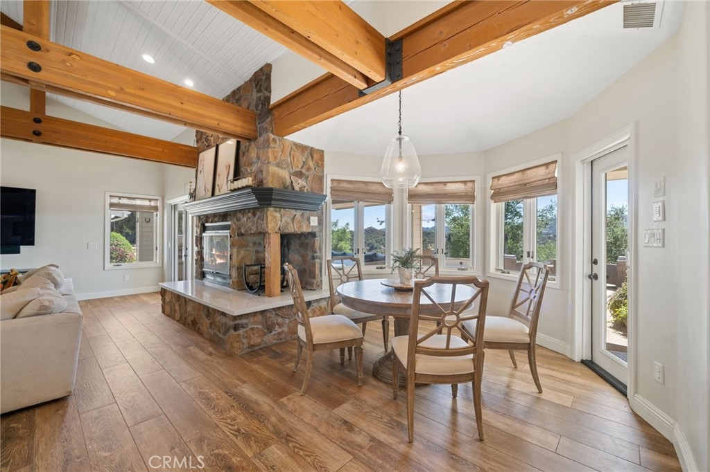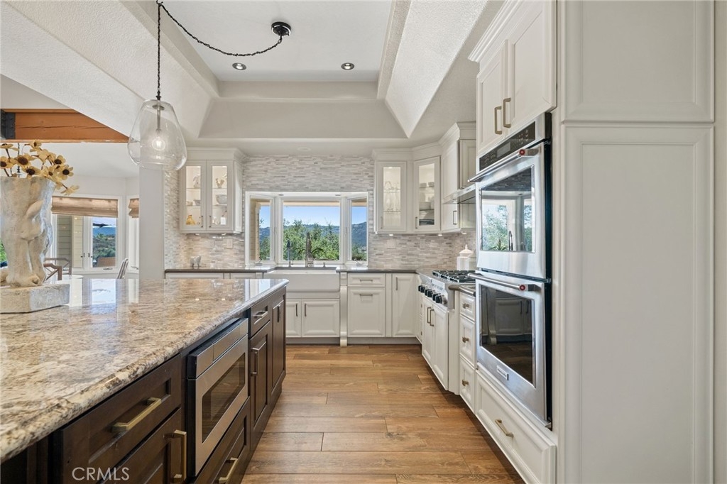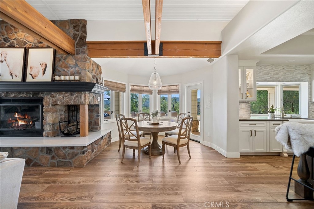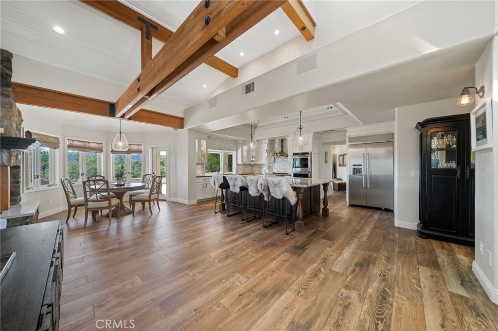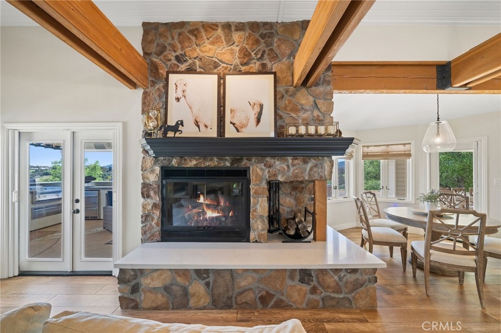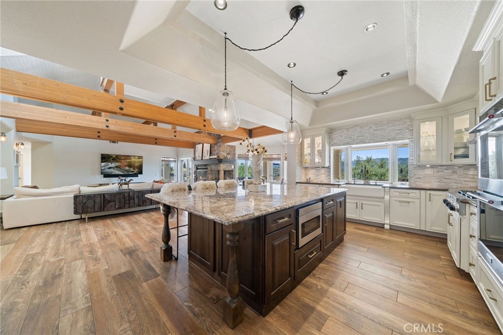 -A chef’s dream kitchen complete with a commercial style cooktop and range hood, double oven, farmhouse sink and Butler’s pantry. The gourmet kitchen seamlessly blends into a grand room adorned with wood-beamed ceilings and a cozy fireplace.